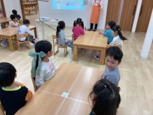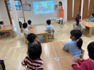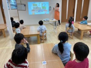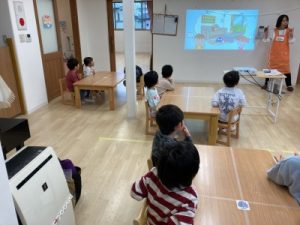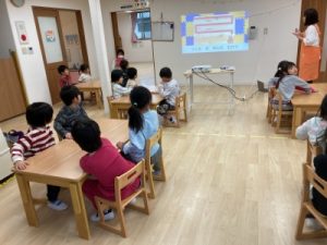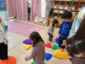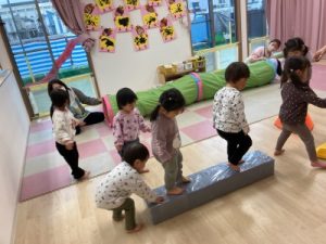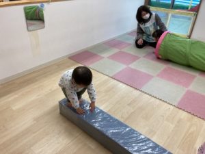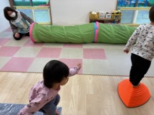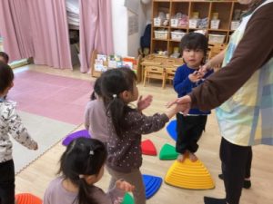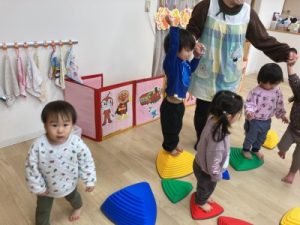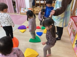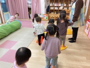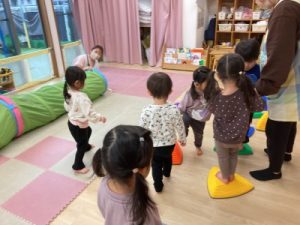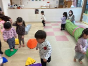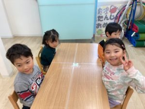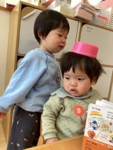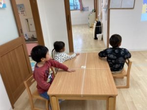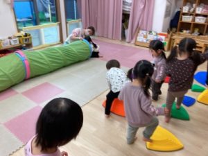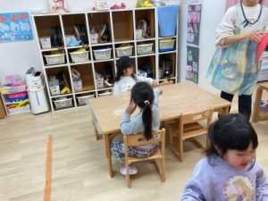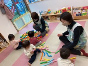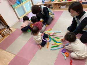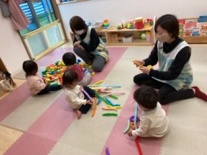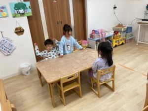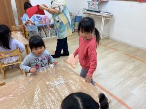 あひる組、晴れ間を見て園庭でシャボン玉遊びをしてからお部屋で遊んでいました(^^)/