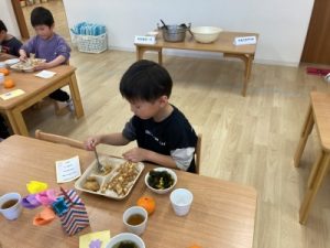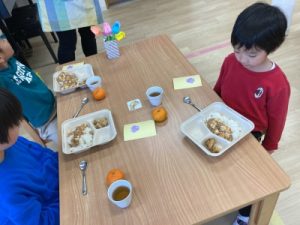 机の上にはメニュー表やお花ものっていて、お給食の先生がたくさん色々なものを用意してくれていましたよ。